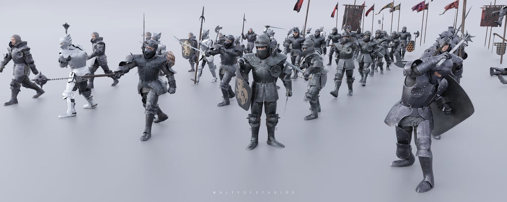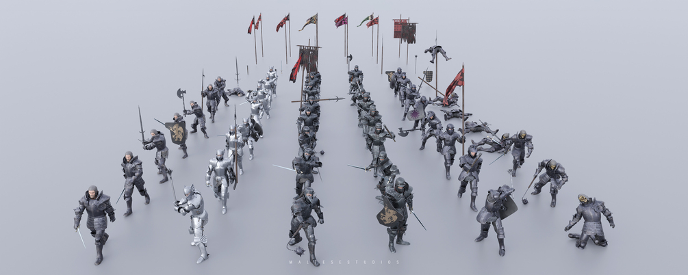 This pack includes 6 Rigged Knights, 50 posed Characters, 25 props, including 10 flags, 4 shields and different swords an axes. 3 different materials per character, 2 different material per weapon. Assets vary from low to high poly. All assets are optimized for game engines and all major 3D packages. Compatible with Mixamo animations. Formats: Blend, OBJ, FBX,